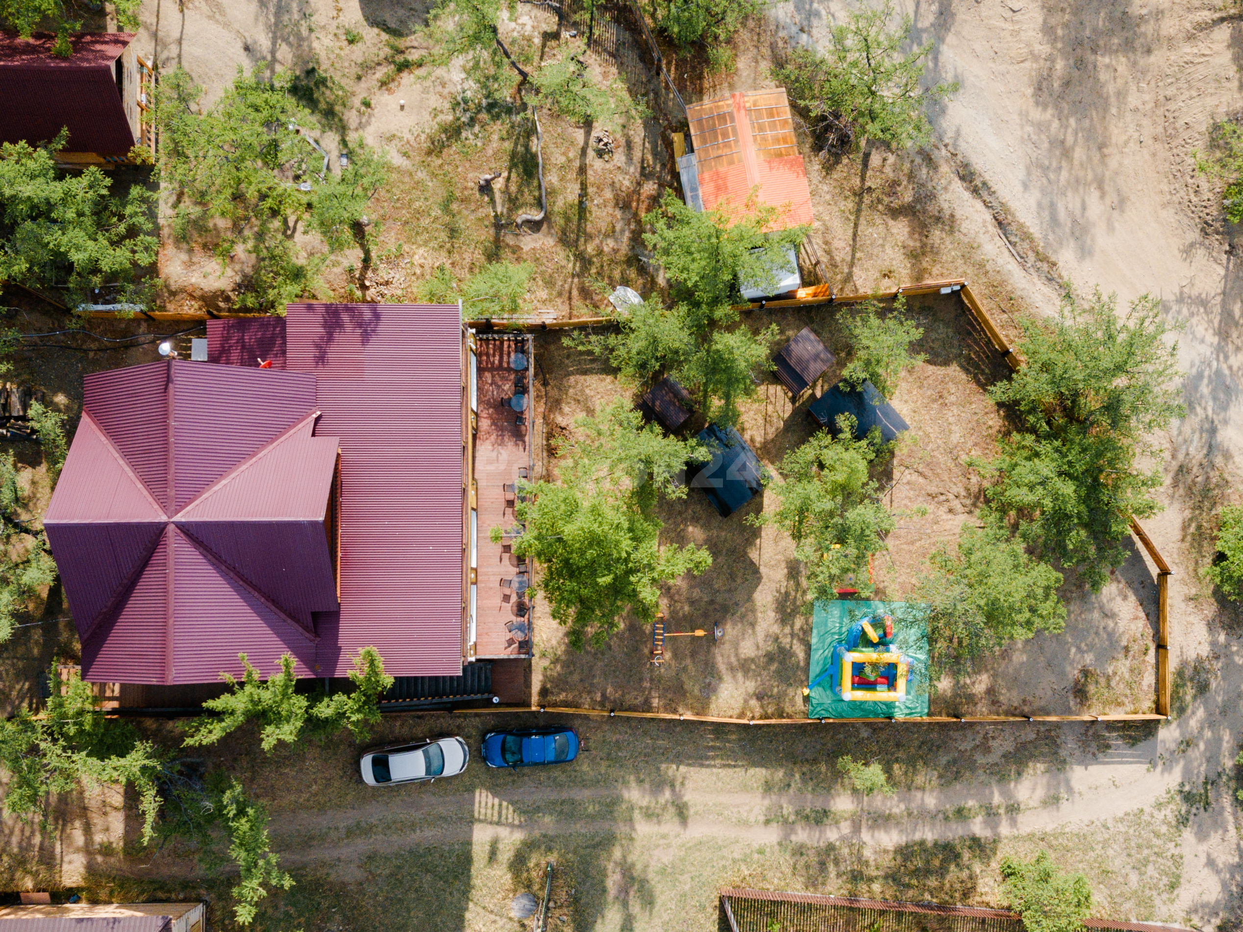 Гостевой дом расположен на трёх смежных земельных участках общей площадью 40 соток (30 соток + 5 соток + 5 соток).